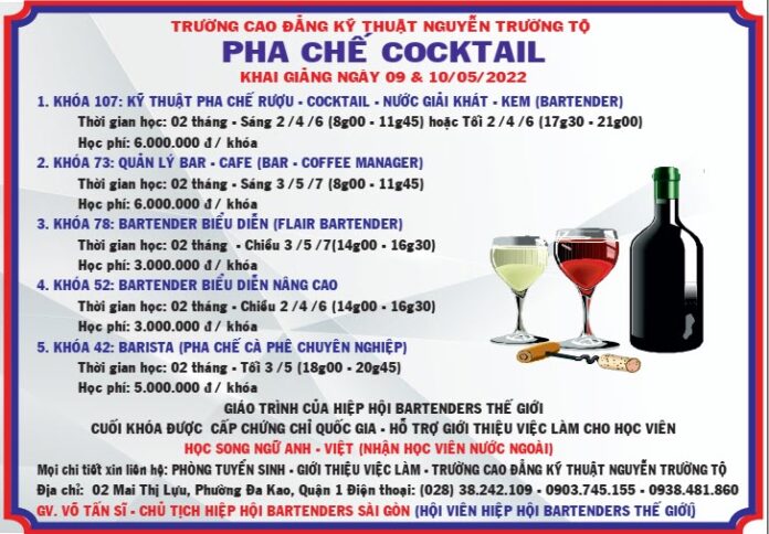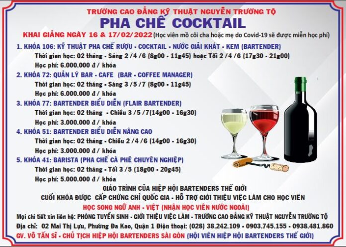 GIÁO TRÌNH CỦA HIỆP HỘI BARTENDERS THẾ GIỚI CUỐI KHÓA ĐƯỢC CẤP CHỨNG CHỈ QUỐC GIA HỖ TRỢ GIỚI THIỆU VIỆC LÀM CHO HỌC VIÊN HỌC SONG NGỮ ANH – VIỆT (CÓ NHẬN HỌC VIÊN NƯỚC NGOÀI) Mọi chi tiết xin liên hệ: Phòng Tuyển Sinh – Giới Thiệu Việc Làm – Trường Cao Đẳng Kỹ Thuật Nguyễn Trường Tộ Số 02 Mai Thị Lựu, Phường Đakao, Quận 1. TP. HCM ĐT: (028)38.242.109, 0938.481.860 hoặc 0903.745.155. (Giảng viên: Võ Tấn Sĩ – Chủ tịch hội Bartenders Sài Gòn – Hội viên Hiệp hội Bartenders Thế Giới). |